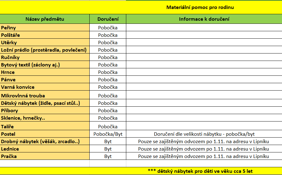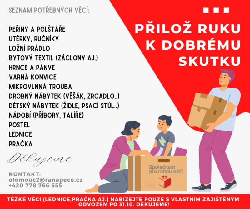 Pokud máte chuť a možnost, můžete s námi podpořit jednu z našich klientských rodin, která v červenci přišla o 4-měsíčního chlapečka. Mají dvě prima předškolačky (jedna z nich nedávno ukončila léčbu nádoru), a společně se stěhují do nového bydlení, v Lipníku nad Bečvou. Jelikož se nacházejí v těžké finanční situaci, hledáme pro ně touto formou základní věci k žití, které jim usnadní nový start.