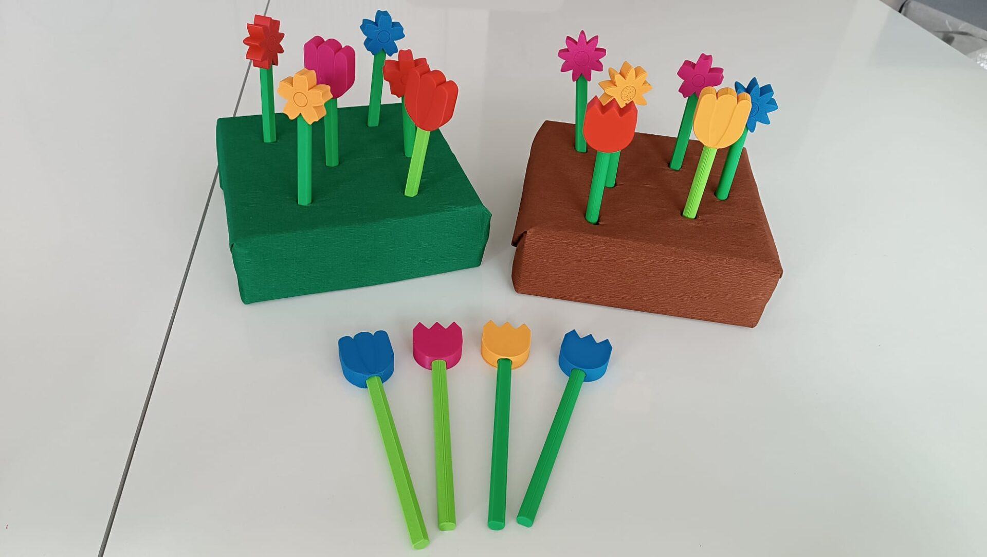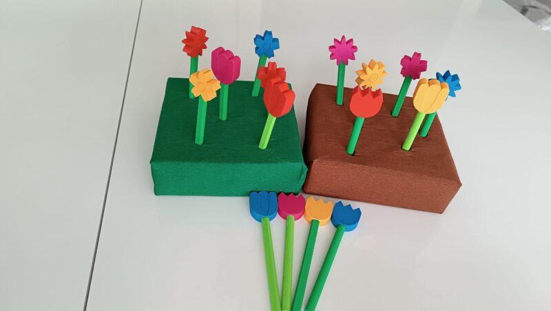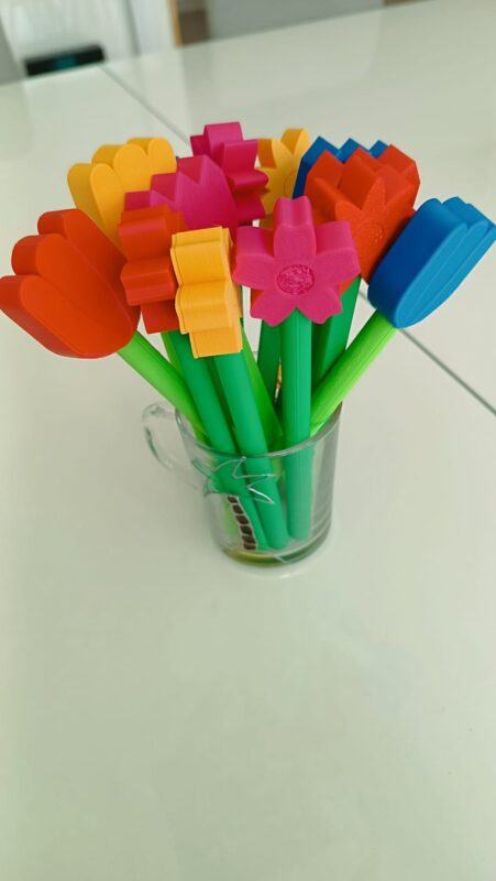 Na 3D tiskárně si můžeme vytisknout květiny (případně s vázou), které slouží jako hmatová a zraková pomůcka pro děti se zrakovým či kombinovaným postižením. Jednotlivé květy mají výrazný tvar, reliéfní detaily a jsou navrženy tak, aby se daly samostatně uchopit, vkládat do vázy a znovu vyjímat. Pomůcka je vhodná přibližně pro děti od 3–4 let, vždy s ohledem na jejich individuální schopnosti.